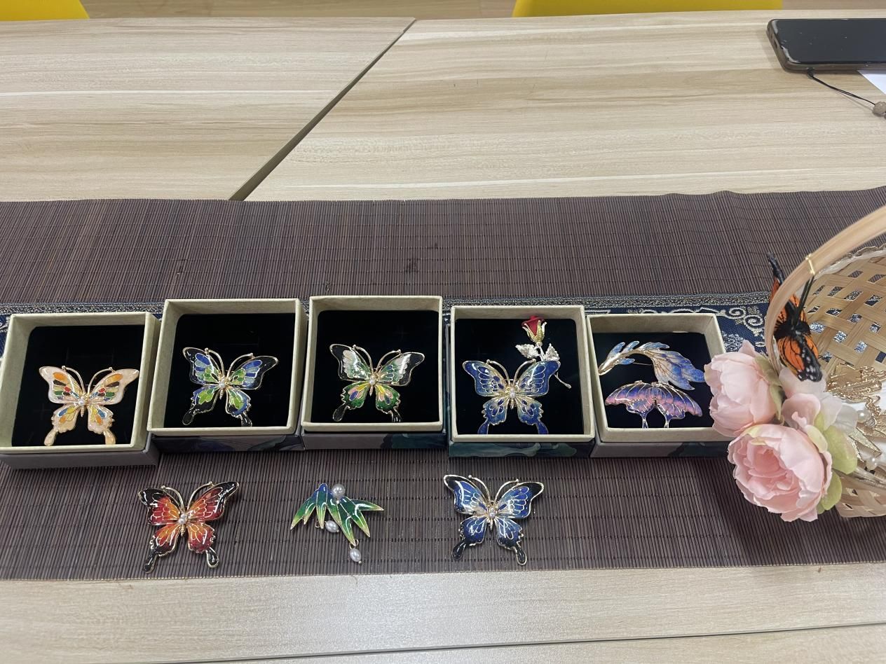 指导老师首先为大家讲解景泰蓝工艺的历史渊源,随后分发彩沙、调料盘、刻刀、胶水、胸针、手链等材料,此次手工省去了掐丝的环节,只需将珐琅专用彩砂代替珐琅釉料去进行点蓝、上胶和固封。大家认真聆听,仔细操作,充分发挥自己的创造力和想象力,每一步都充满了挑战和乐趣,每一个作品都活灵活现,别具一格。经过一个多小时的努力,色彩绚丽、独具匠心的景泰蓝胸针及手链就在师生手中诞生,看着自己亲手制作的作品,大家洋溢着满足和自豪的笑容。