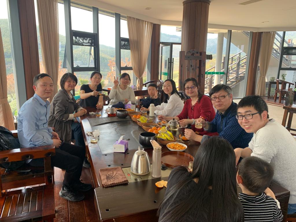 下午老师们又赴俞氏五峰茶园品茶,春天的茶园,绿树环绕,翠竹婀娜,茶香四溢。最引人注目的就是悬在空中的茶壶,没有支点却能水流不断,老师纷纷拿出手机,“打卡”留念。在山顶观景台上老师们品茗叙话,交流分享工作学习心得,在清幽茶香中度过了美好的时光。