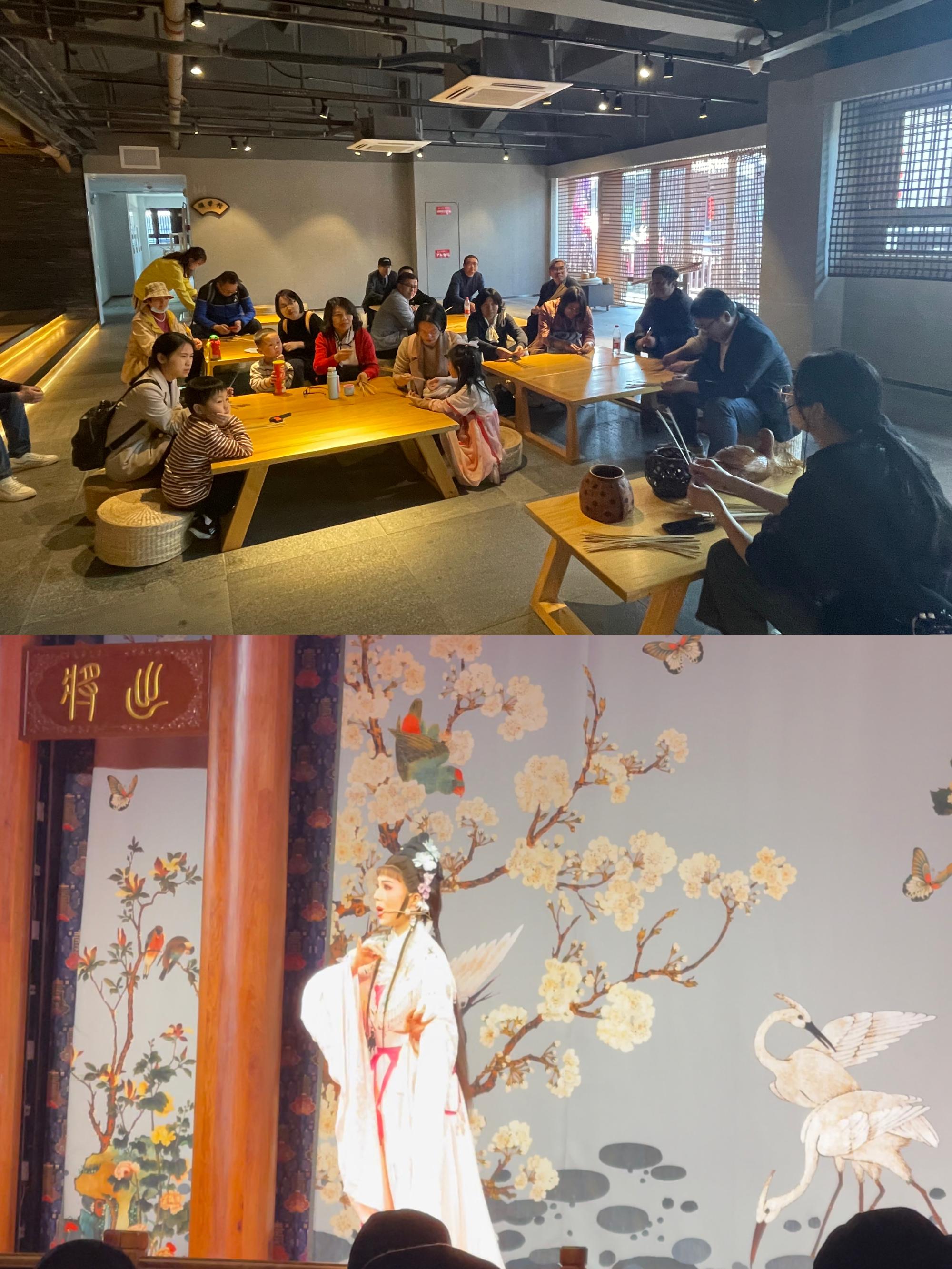 下午大家又来到越剧小镇,越剧小镇是以山水为承载、戏剧为核心的文化旅游小镇。老师们在浏览古戏楼、聚贤阁、古韵剡溪之余,进行了非遗文化体验-竹编制作,让大家深入感受了“跳跃在指尖的竹编艺术”,之后在古戏楼剧场观赏了越剧折子戏,唯美的曲调,婉转的唱腔,真切的表演,让大家感受传统艺术魅力,增进戏曲文化的熏陶。