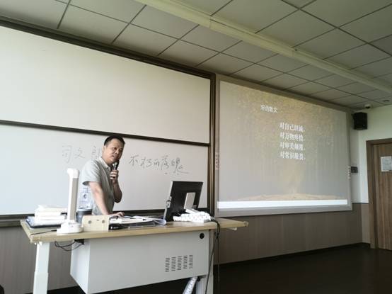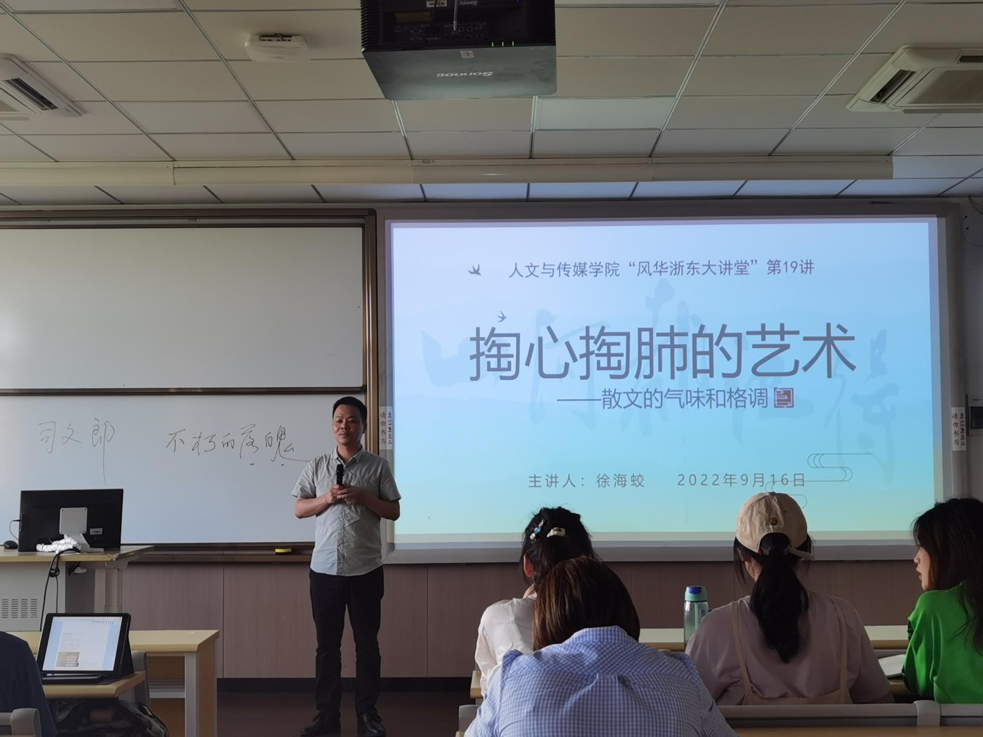 徐海蛟先生学识渊博,谈吐幽默,对散文写作有着独到的见解,在座师生备受启发。本场讲座由徐琼老师主持,学院师生70余人聆听了讲座。