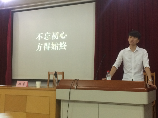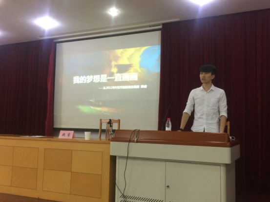 下午3时10分,讲座正式开始。魏睿首先由“梦想”引入,告诉同学们他的梦想其实就是一直画画,由此展开其从小到大的发展历程。魏睿小时候酷爱画画,并展现出优秀的天赋,坚持画画。高考之后,魏睿来到了第一版主