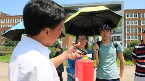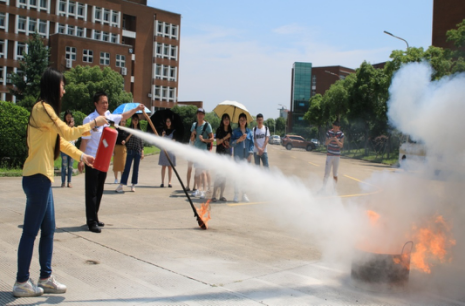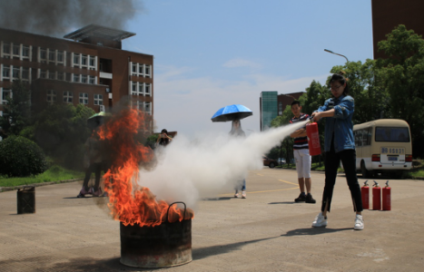 保卫处徐老师向学生详细讲解了灭火器的构造、使用方法、灭火操作步骤、注意问题和禁忌事项等。灭火器按移动方式可分为:手提式和推车式;按驱动灭火剂的动力来源可分为:储气瓶式、储压式、化学反应式;按所充装的灭火剂则又可分为:泡沫、干粉、卤代烷、二氧化碳、清水等。