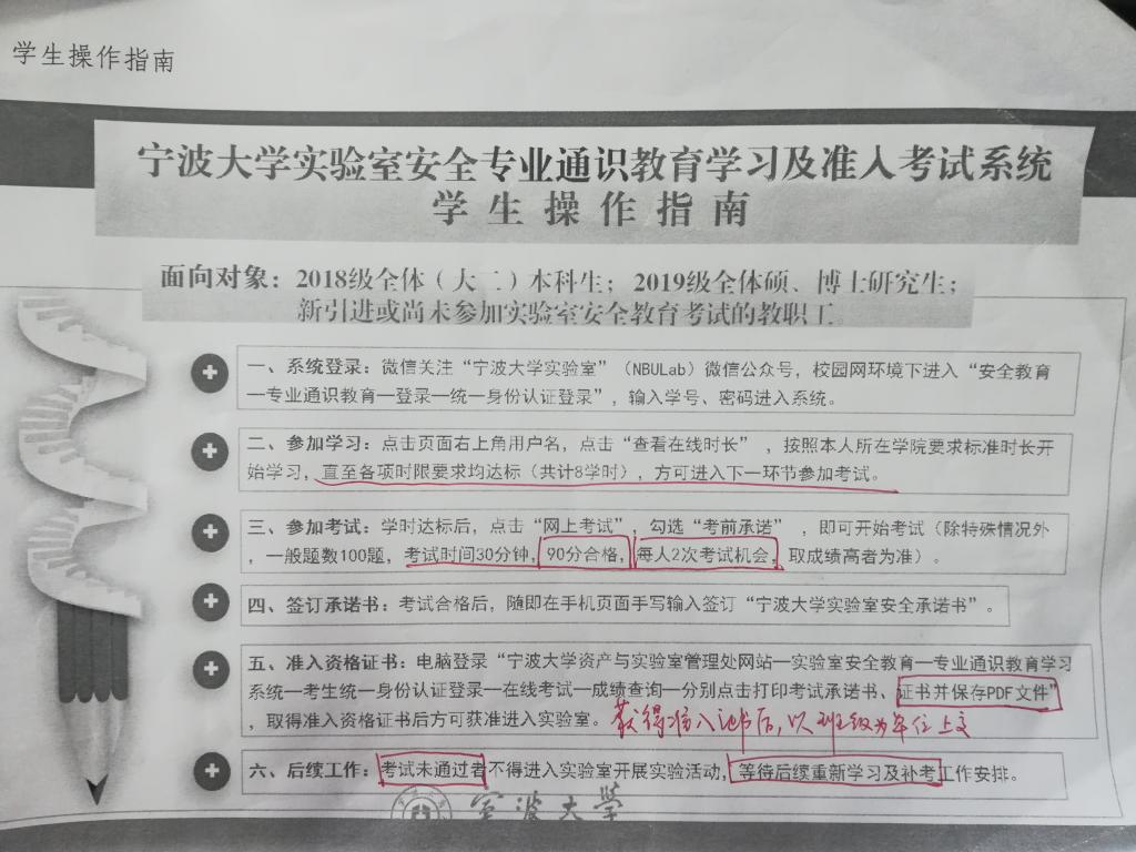 学习和考试均在网上系统操作,学生须在上述规定时间内登录“系统”,参加学习,在学习时间达标后,方可参加考试,考试合格后,签订“实验室安全承诺书”、而后下载保存“实验室安全承诺书”、“实验室安全准入合格证书。” “实验室安全准入合格证书”须打印交给班长,统一上交至学院(具体操作方法详见文后《学生操作指南》)
