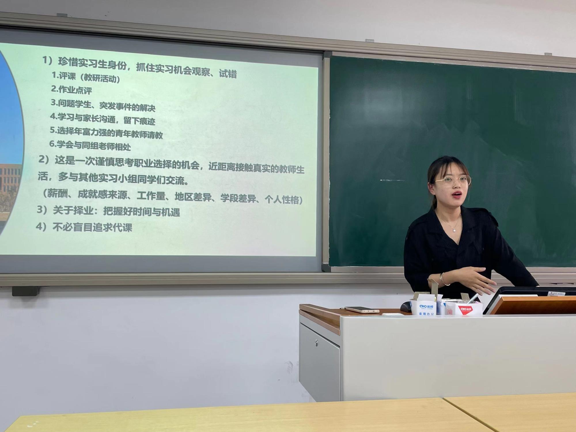 随后,李琪琨、李玥一、赵柯人等八位优秀的学长学姐们逐一分享了各自在实习过程中的收获与感悟。他们从班主任工作、语文教学、与实习点指导老师关系、与所教学生之间关系、个人心路历程与体会等方面进行分享,深切体会到作为教师的辛苦与幸运。