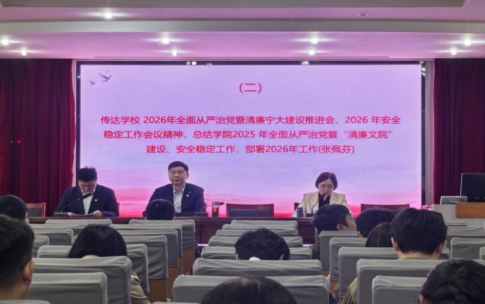 会议学习传达习近平总书记重要讲话和重要指示批示精神,深入学习贯彻落实学校2026年全面从严治党工作暨清廉宁大建设推进会、安全稳定工作会议精神。总结过去一年学院全面从严治党暨清廉文院建设和安全稳定工作情况,部署安排2026年重点工作,进一步统一思想、凝聚共识、压实责任。。