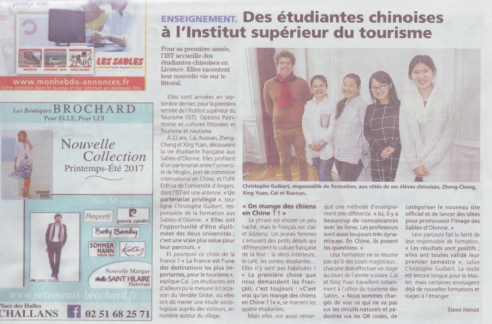 同时,近期,法国度假小城LES SABLES出版的报纸LES SABLES专门采访了人文学院在昂热大学旅游与文化学院Sables-d’Olonne校区就读的 4名13级旅游管理中法合作专业本科学生。昂热大学旅游与文化学院去年秋季在大西洋畔的度假小城LES SABLES开办了第4个校区,首期开设了海滨文化与遗产、旅游与水上运动2个本科专业,法国现外长、前总理埃罗专程前往参加揭幕典礼,还接见了在该区就读的第一版主