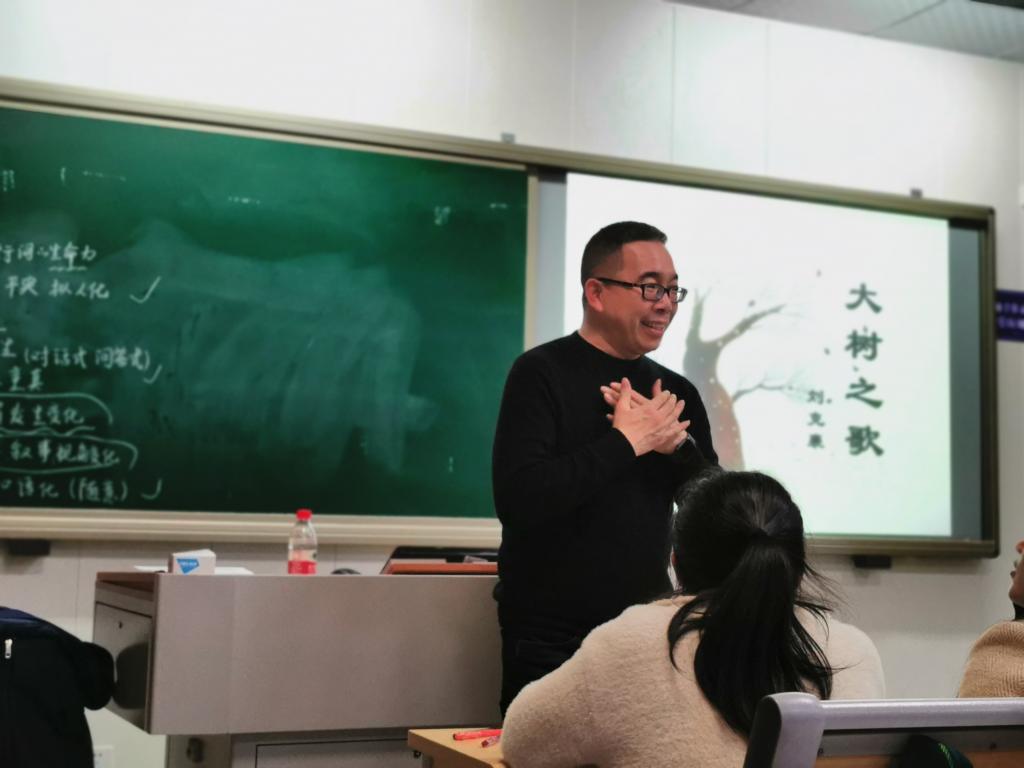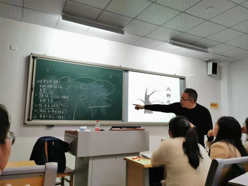 刘飞耀老师首先从他近期在各大高校的教师招聘会上的所见所闻所想出发,分析了教师的就业前景,以及重点强调了作为一名应聘语文教师,要注重面试的细节和平日语文功底的积累。接着,刘飞耀老师以身示范,从《大树之歌》这篇文章入手,分别从教学设计、文本解读、课堂演绎三个方面详细、生动地为学生们展示方法和技巧,并提出了在进行散文教学时,要从个性化的语句章法、个人化的言说对象以及独特的情感认知三个方面着手,建立学生与“这一篇”散文的链接。