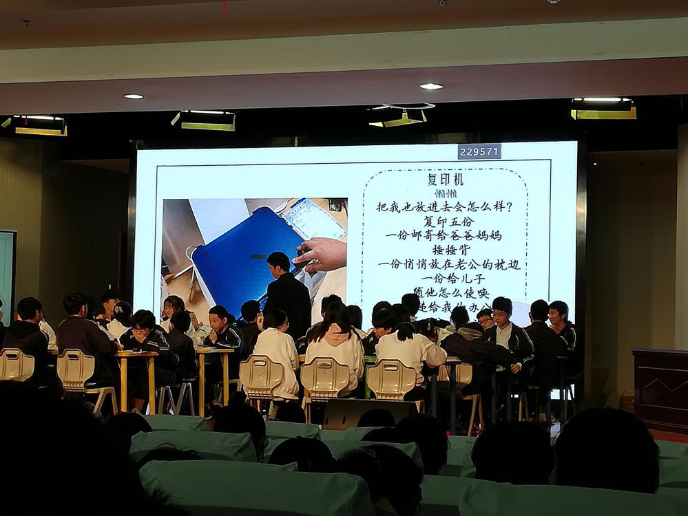 11月23日至27日正值学校“蔚蓝向往”主题课堂节活动,在参观完校园后师生们前往小报告厅观摩初中部的语文课堂。耿锋贤老师和806班同学们为大家带来了一堂生动精彩的语文课。本课主题是“一首诗的诞生”,老师先是循循善诱,教会学生怎么样利用生活中常见的事物进行诗歌创作;再在老师的引导和学生的逐层探究下,学生们能够独立思考并创作出极富想象力的诗句,获得了现场所有师生的掌声。课后,来自浙江师范大学的高玉平专家对各位老师的课堂做出了精彩点评。高老师指出,诗歌鉴赏、朗诵和创作的教学就是发现、传达和创作美的过程,教师在上课过程中,从内容到形式要浑然天成,注重对学生的启发。学生对诗歌的理解是多样性的,创作出的诗歌也是各有风采。她对教育实习生提出了几点非常实用的建议:小组讨论的任务要明确,不能走形式;选取的课堂鉴赏文本要贴合学生实际等。在座的所有教育实习生都收获满满。