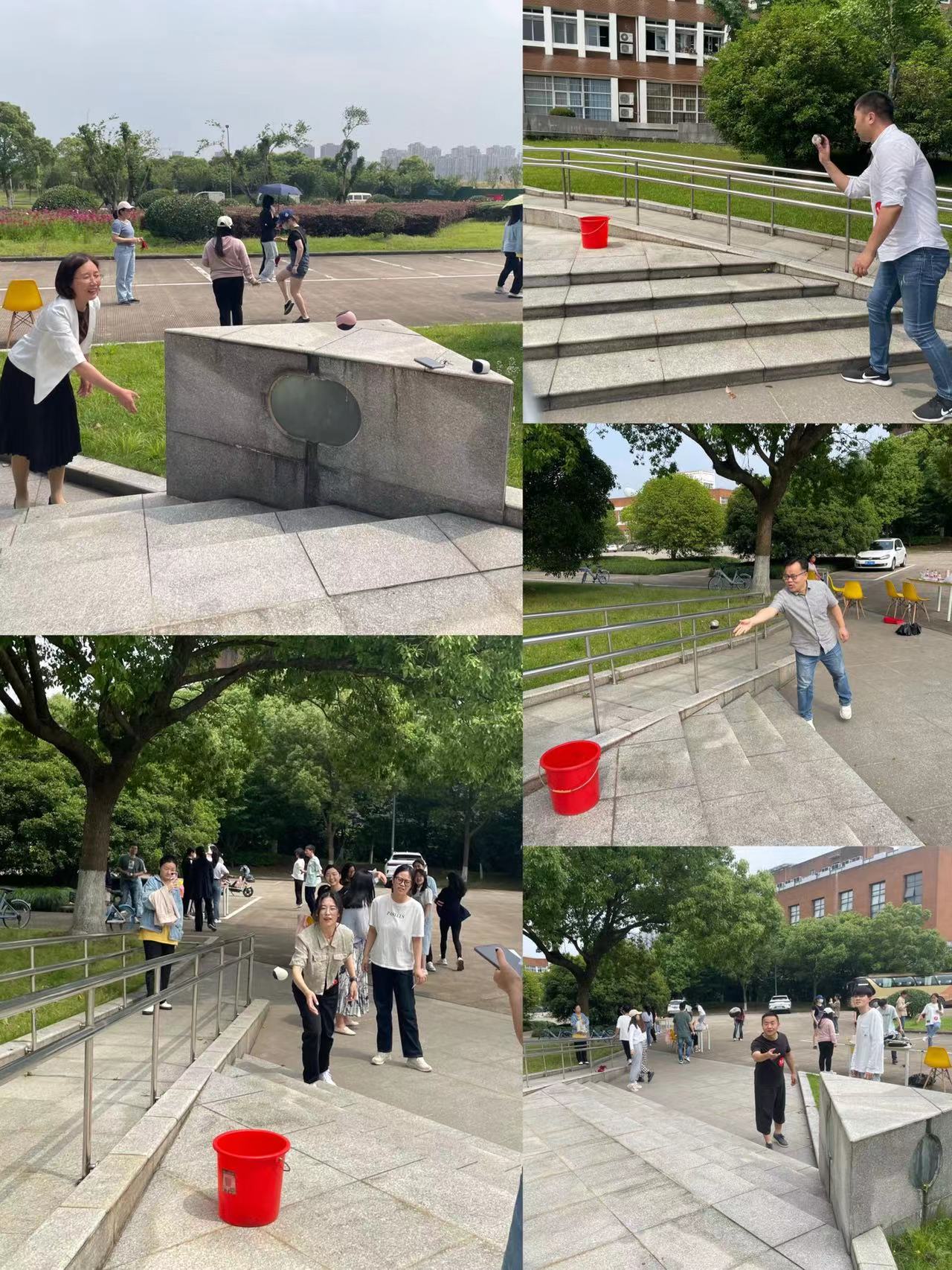 投运沙包项目也充满了趣味性,选手们需要将圆形的沙包顶在头上、走下楼梯,再投入放置在不远处的桶中。在头顶沙包的环节,不少选手屏气凝神,双手平举来稳定自己头上的小沙包,谨慎程度不亚于走钢丝。在投掷沙包的环节,选手们都在思考怎样才能投出一个完美的抛物线,若有老师或同学一投就中,会赢得现场一片欢呼声和鼓掌声。