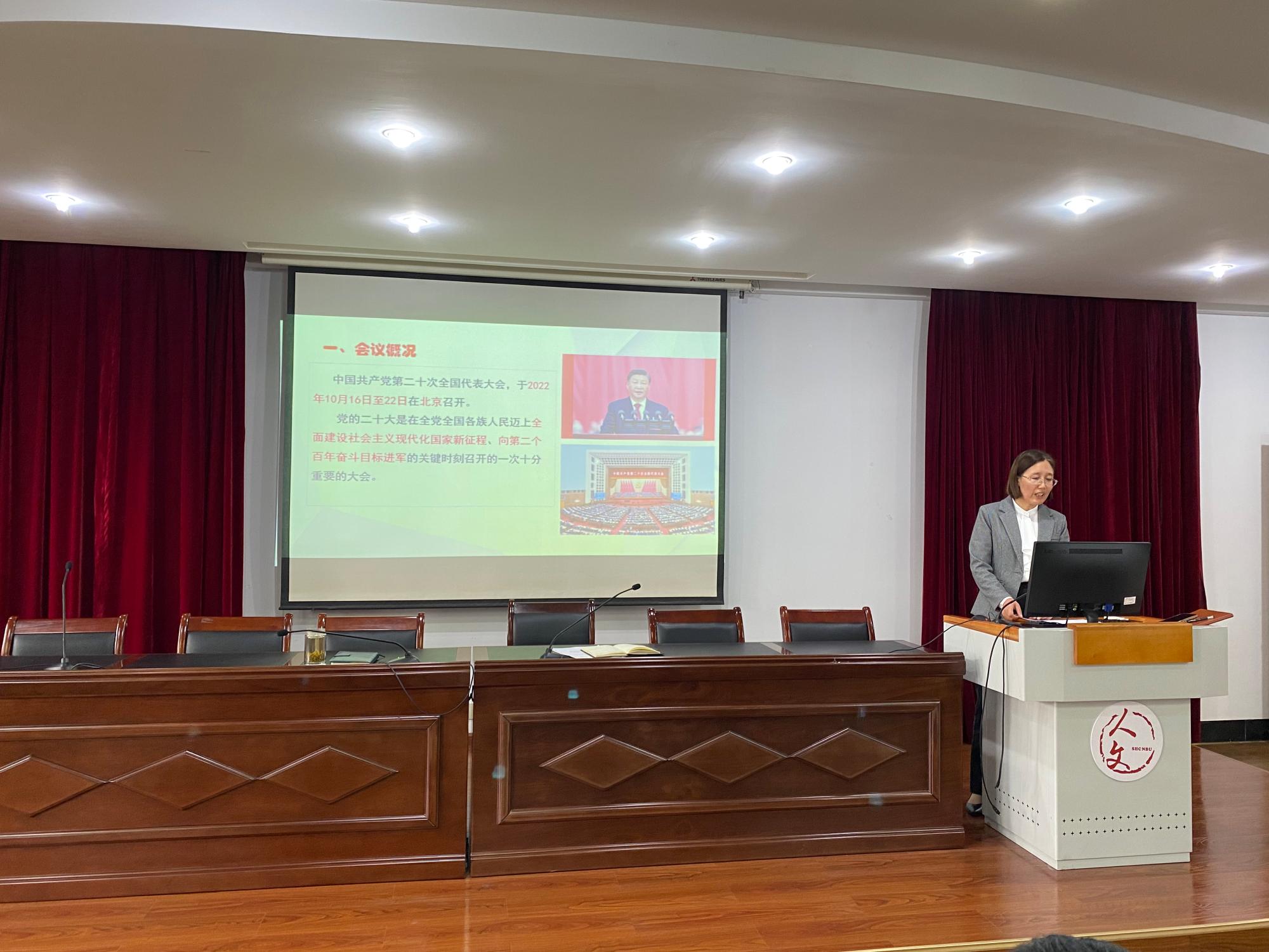 会上,张佩芬书记向全院教职工传达了党的二十大精神。她要求全体教职工增强政治自觉,深刻领会大会精神;增强理论自觉,学深悟透大会报告;增强行动自觉,持续推进各项工作。她强调老师们要以党的二十大精神为指导,努力贯彻落实立德树人根本任务,践行为党育人为国育才初心使命,不断提高人才培养水平,努力培养德智体美劳全面发展的高素质人才,为全面建设社会主义现代化国家,全面推进中华民族伟大复兴贡献教育力量;要结合我们学院的专业、学科优势和特色,主动服务国家战略,提升科研创新能力、文化创新能力,发展社会主义先进文化,为增强中华文明传播力影响力贡献人文力量。
