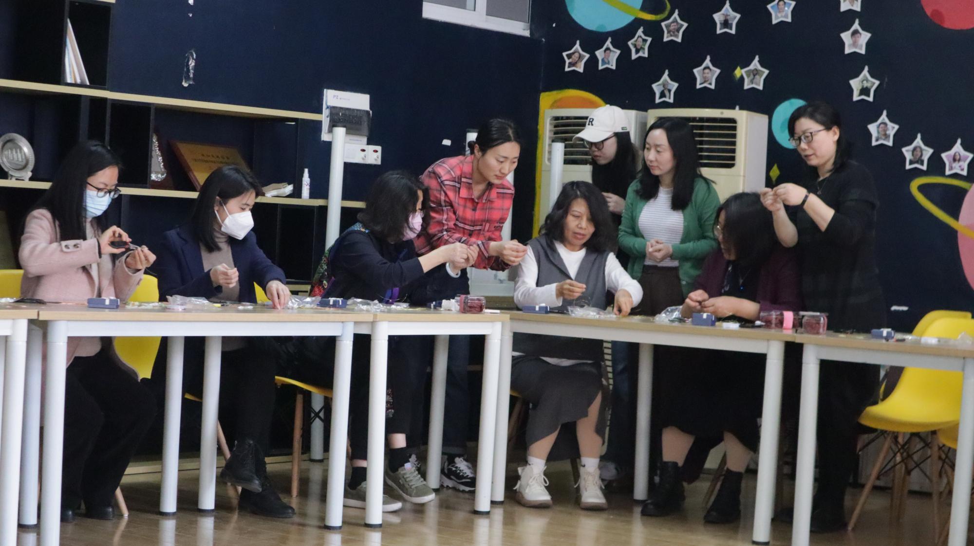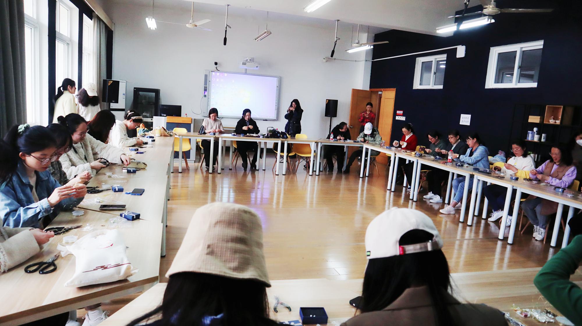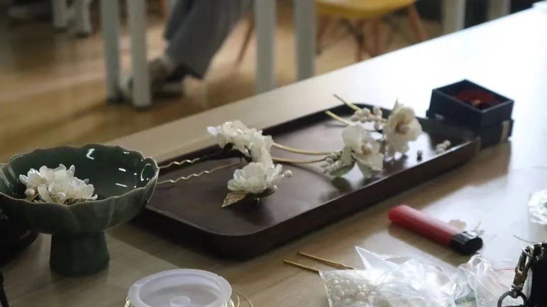 簪花老师早早地来了,给每一位参与活动的老师同学配备了制作工具。看着簪花已经制成了范例,不少同学和老师就迫不及待地向簪花老师请教簪子的制作过程。待参与的师生齐齐落座,簪花老师就带领大家开始今天的手工之旅。