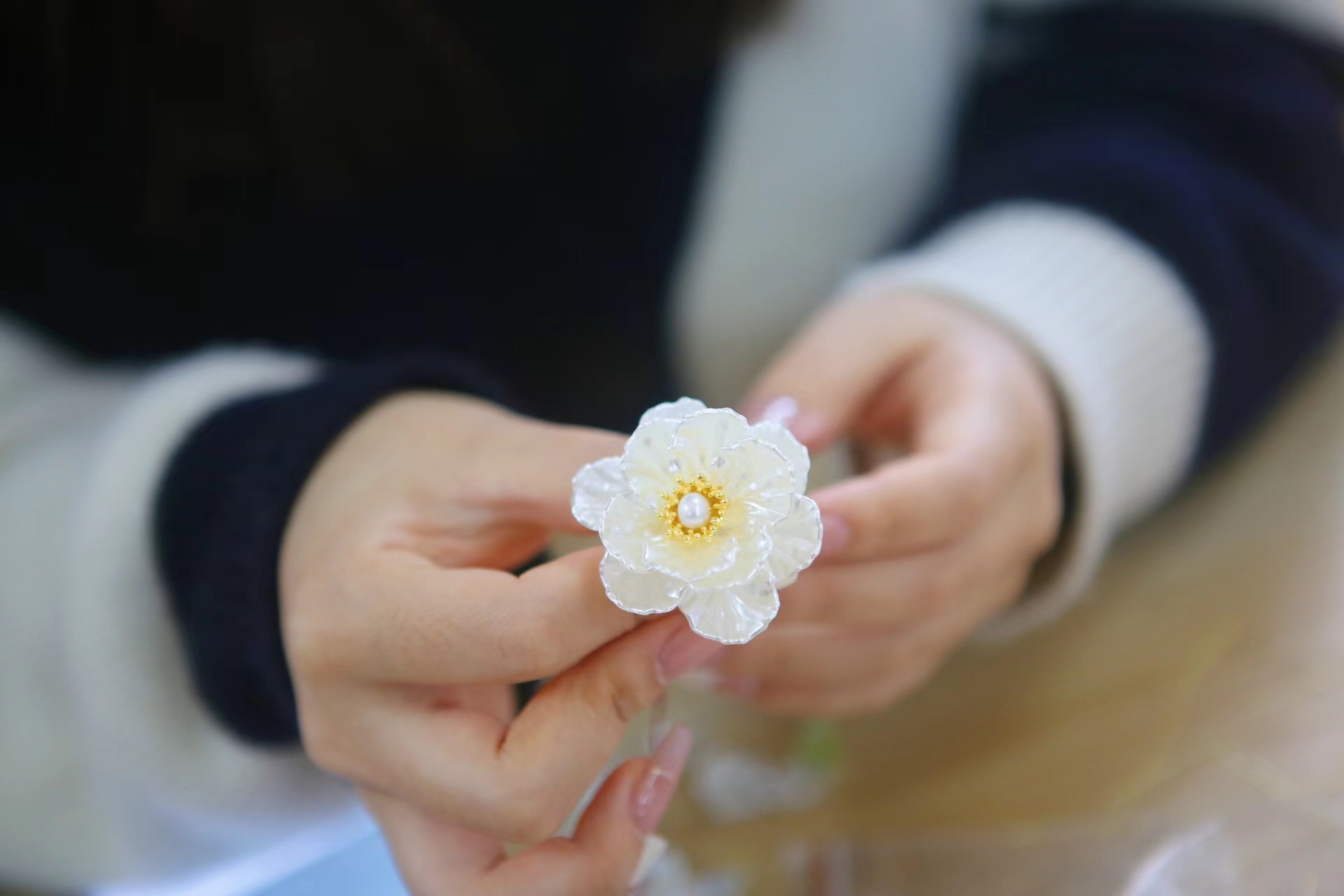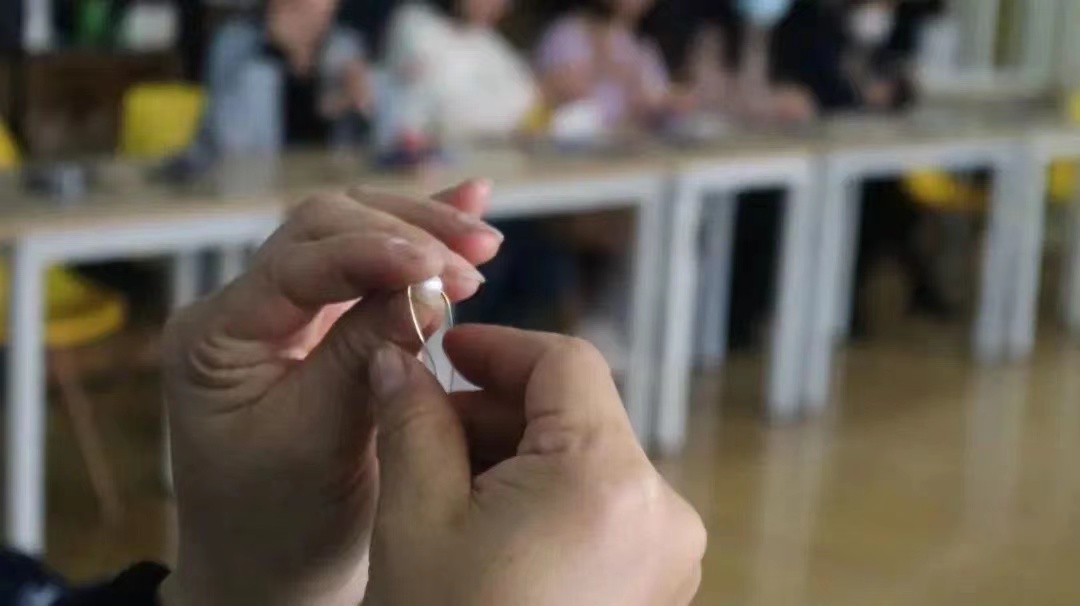 簪花老师用轻柔的嗓音描绘出远古时期胸针形成的场景,讲解各个工具的具体用法和制作的详细步骤。讲到关键点时还会走到师生中间的位置展示半成品,以便在座的簪花人更好理解制作过程。得益于簪花老师清晰地讲解,大家很快掌握了方法。