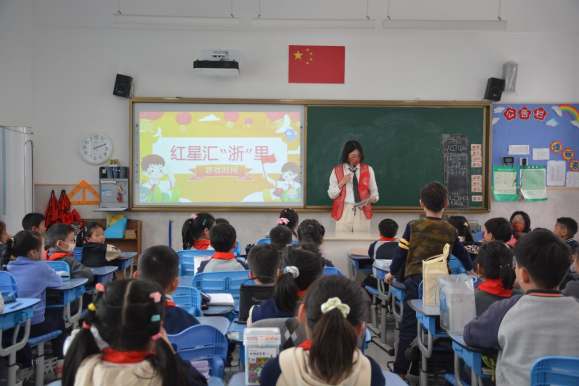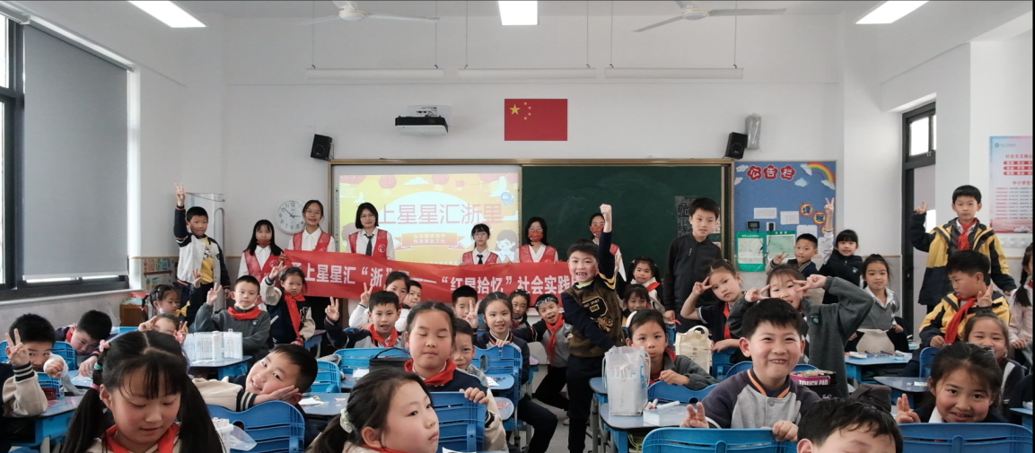 附属学校小学部二年级(13)班中采用动画视频引入、折五角星、学唱红色歌曲、分发党史文创产品等方式进行。宣传团队带着年轻又充满活力的小学生们一步步了解浙东党史,增强了学生对浙东革命者立体形象的认识,提升了学生对党史学习的兴趣。活动中,宣传团队还就党史学习、活动体验等方面,与学生展开了感想交流。