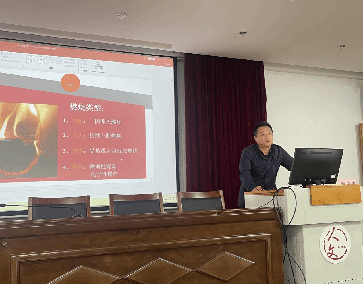 演练正式开始之前,保卫处郑勇辉老师在10号楼209室先给两个学院的师生进行消防安全教育,介绍防火灭火的常识。他围绕校园火灾特点和危害,用通俗易懂的语言向师生讲述校园起火原因、如何正确拨打119报警电话及火场逃生自救技巧等消防安全知识。