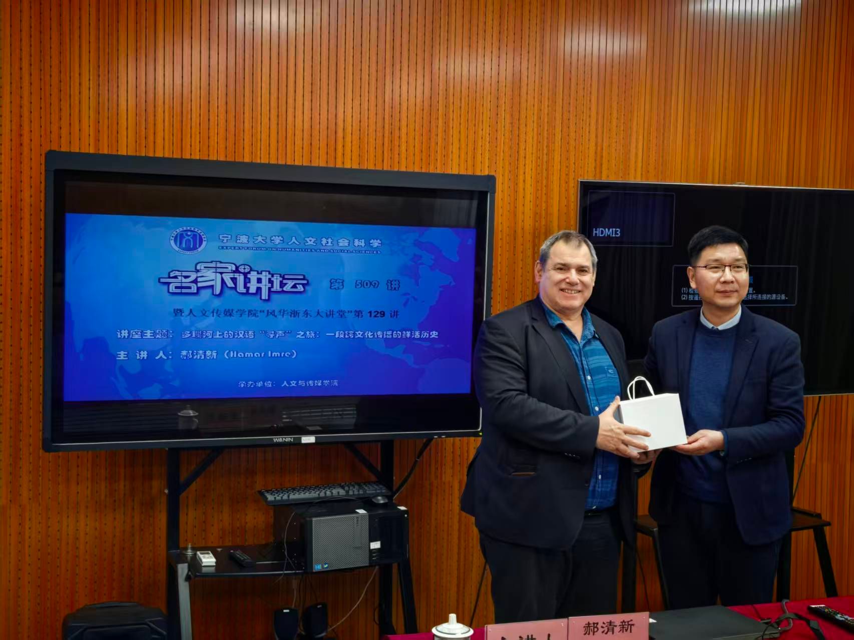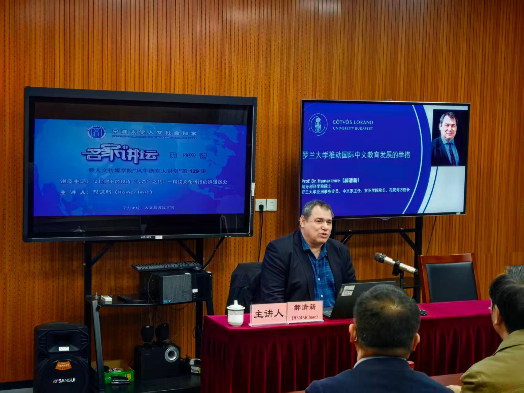 11月19日,第一版主 “人文社会科学名家讲坛”第509讲暨第一版主 “风华浙东大讲堂”第129讲举办。匈牙利科学院院士、罗兰大学副校长郝清新(Hamar Imre)应邀作了题为“多瑙河上的汉语‘寻声’之旅:一段跨文化传播的鲜活历史“的专题讲座。讲座由第一版主 副校长戴世勋主持。